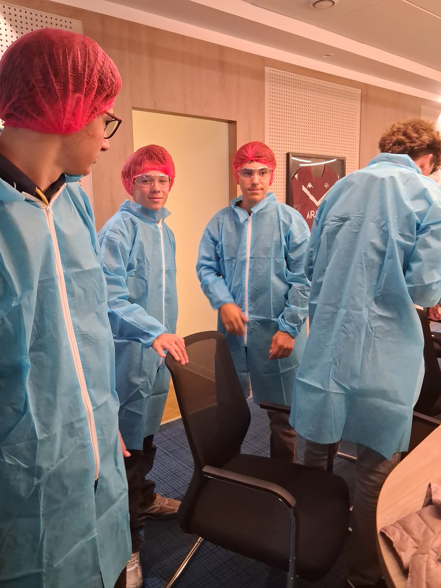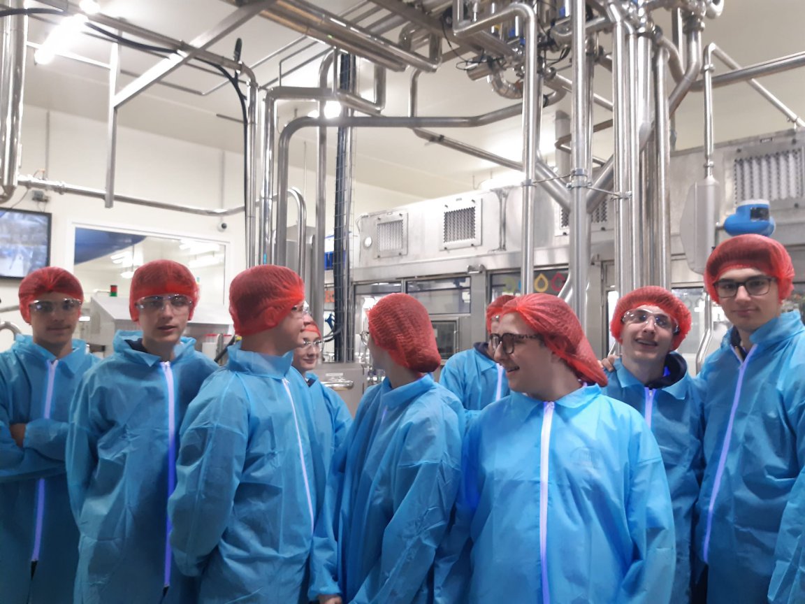 Après une présentation de l'entreprise, les élèves ont été munis des équipements de protection individuelle (lunettes, charlotte, blouse, surchaussures) afin de respecter les conditions d'hygiène et de sécurité sur le site de production.